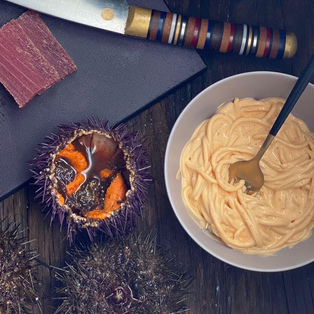 Carbonara de erizos de mar y mojama de atún